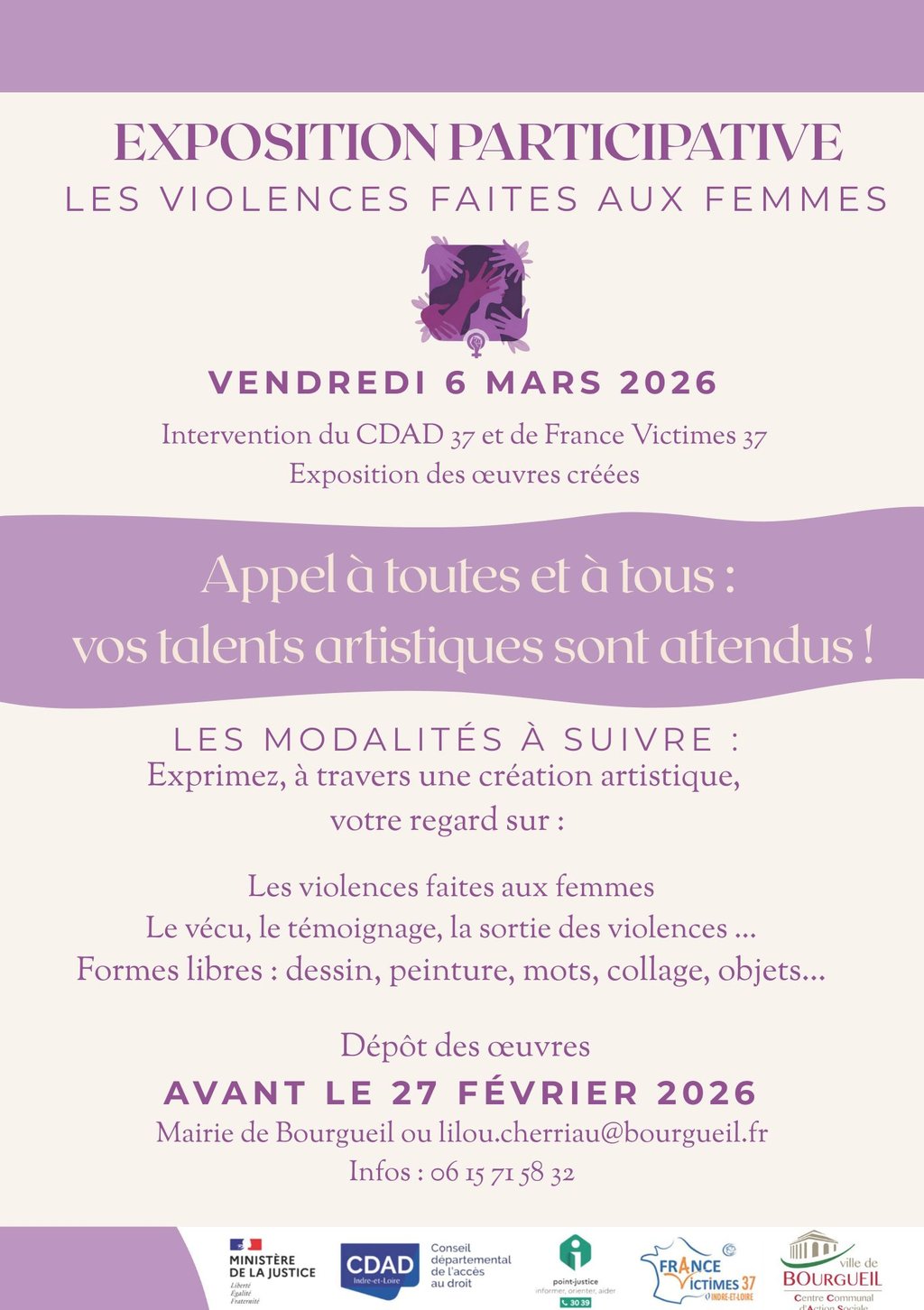 Présentation : 6 mars 2026, dans le cadre d’une intervention du CDAD 37 et de France Victimes 37 : « Accueillir et orienter une femme majeure victime de violences au sein du couple ». Exposition des œuvres réalisées.